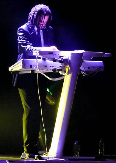 The stage for The Human League was stark but effective with a back screen of vivid colours and images. Dressed in elegant black evening dresses, singers Joanne Catherall and Susan Ann Sulley took their places at each end of the stage, while the drummer/percussionist was flanked by two keyboard players, including a multi-instrumentalist who alternated between keyboard, keytar, and guitar. The production was slick and so was the music. I had to wonder at the wisdom of singer Phil Oakey wearing a long black tunic ensemble in the rather extreme heat, assuming that the temperature under the bright lights would be even more intense but he seemed to be coping better than me, I must say. The band looked good and sounded good. Opening with ‘Sky’, and then ‘Mirror Man’, accompanied by the vibrant and ever-changing graphics behind them. The set-list took us through some classic Human League numbers, notably ‘The Lebanon’, ‘Heart Like a Wheel’, ‘(Keep Feeling) Fascination’ and ‘Love Action (I Believe in Love)’.
