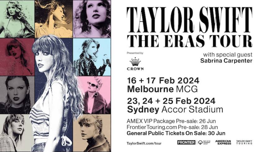Taylor Swift announced additional dates to Taylor Swift | The Eras Tourtoday. The Australian dates of Taylor Swift | The Eras Tour, presented by Crown and Frontier Touring, will kick off on 16 February 2024 in Melbourne and 23 February 2024 in Sydney with special guest artist, Sabrina Carpenter. Pre-sale tickets and VIP packages will be available via frontiertouring.com/taylorswift from …